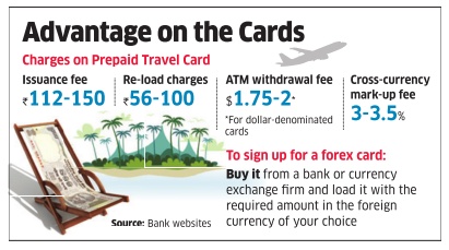 “They can come to your aid while making payments online or at parking lots in your destination countries. Convenience is the key benefit,“ says Roongta. To sign up for a forex card, you can walk into a bank or a currency exchange firm to buy it and load the card with the required amount with the foreign currency of your choice. The issuance fee ranges from ` . 150. Other . 110 to ` charges include cash withdrawal fee at ATMs ($1.75-2) and cross-currency charges. “However, they score over debit and credit cards by eliminating currency fluctuations, as the exchange rate applicable on the day of transaction gets locked in the day you load the card,“ says VN Kulkarni, chief credit counsellor with the Bank of India-backed Abhay Credit Counselling Centre. However, do remember that you need to be vigilant while transacting online with these cards.
