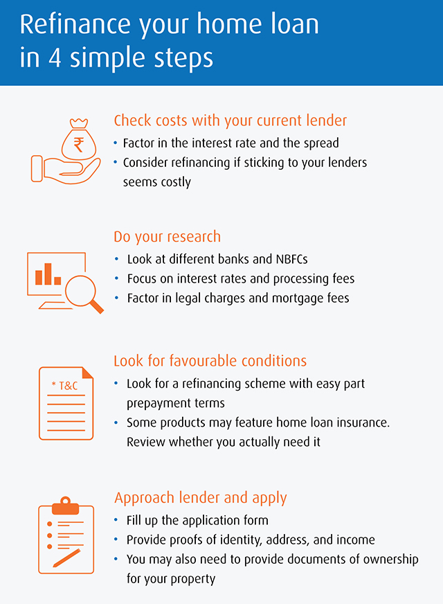 You can refinance your existing home loan. It really means talking to your lending institution and finding out the lowest possible interest rate that you can pay on your outstanding principal amount. Before you speak to your bank, it may be a good idea to talk to multiple banks and find out the best possible rate that they are offering. You can get a quote from them. You will then know the prevailing market interest rate on the property. This would be lower than the home loan interest rates you pay now.
